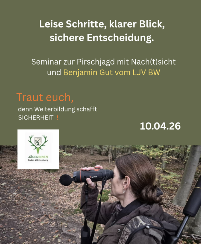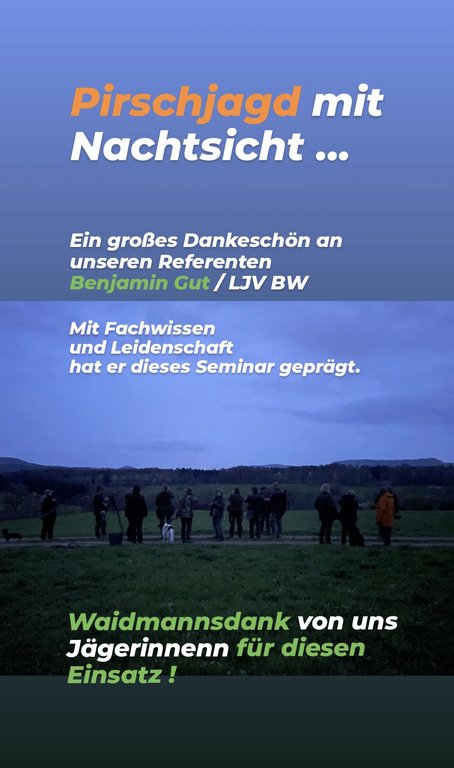 An diesem Seminar "Pirschjagd mit Nach(t)sicht im Raum Esslingen stand eines im Mittelpunkt: sicheres und waidgerechtes Handeln bei Nacht. Fundierte Theorie, intensive Praxis, Technik über Ansprechen bis hin zu rechtlichen Grundlagen. Durch Anleitung von Referent Benjamin Gut /LJV BW wurde den Teilnehmerinnen das nötige Fachwissen vermittelt. Bestückt mit Wärmebildgeräten, Pirschstöcken und bester Laune machten wir eine Rundtour durch das naheliegende Revier.